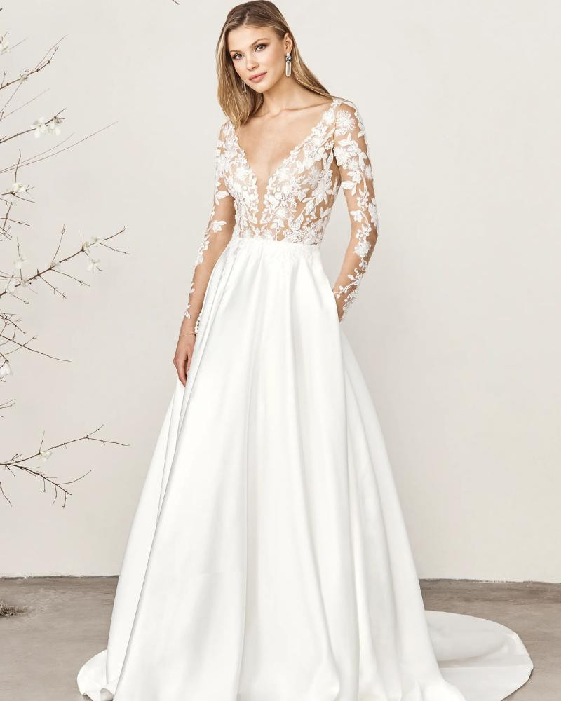 Floral Brocade Long Sleeve Bridal Ball Gown.The modern clean trend is given a feminine twist with this long sleeve ball gown. Designed in a unique floral brocade, it features a V-neckline with a sexy open back that's accented with a slimming inset waistband. The full skirt reveals hidden pockets and covered buttons to the end of the chapel length train. For a truly clean look, this bridal gown is also available in a stretch Mikado version.
