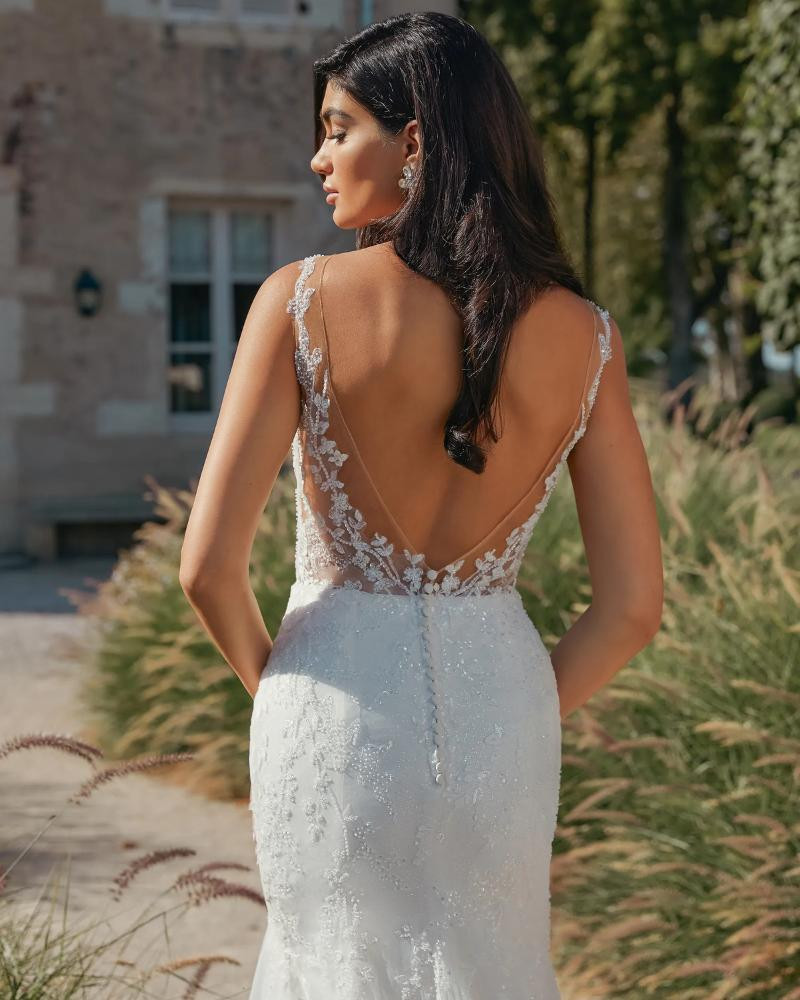 44463 Sincerity by Justin Alexander Wedding Dress. Fit and Flare Bridal Gown with Sheer Bodice and Plunging V-Neckline