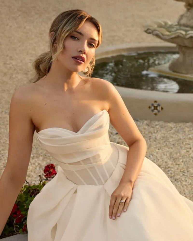 Bring your dream fairytale wedding to life with our timeless Ariane gown. Ariane's ballgown silhouette will have you feeling like royalty on your special day, with the dreamy skirt and chapel-length gracing behind you as you take the aisle. The simple yet daring bodice makes this dress feel ever so special. An off-shoulder beauty with a sweetheart neckline featuring visible boning and organza that drapes perfectly across the bodice, ensuring you feel slightly sexy on your wedding day. Take off the detachable off-shoulder straps for a timeless strapless look. The back bodice contains beautiful fabric-covered buttons that hide the practical zipper back of this dress.