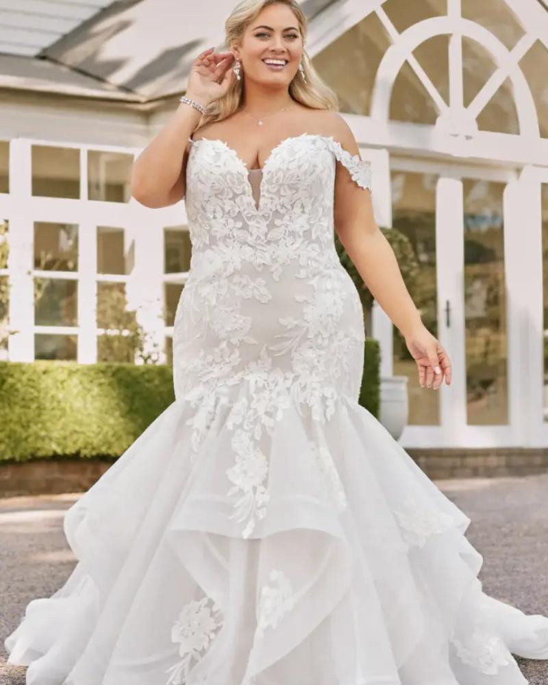 Searching for a wedding dress that's equal parts sexy and sophisticated? Look no further than Indiana, a sexy off-shoulder mermaid wedding dress featuring a sweetheart bodice embellished with delicate sequined lace appliqués. The flattering mermaid silhouette is crafted from cascading layers of glitter and misty tulle and continues round the back to create the train of dreams. Indiana is completed with detachable off-the-shoulder straps offering brides a stylish yet versatile look.