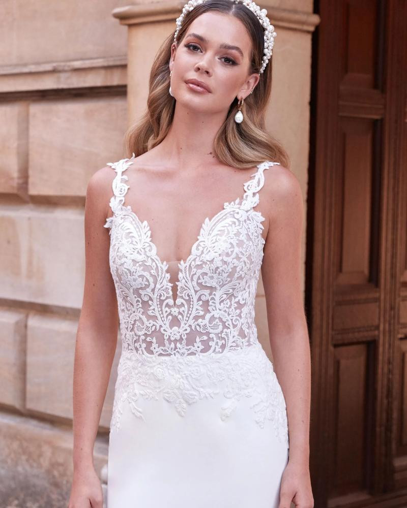 This figure hugging stretch crepe fit and flare is a wedding dress to dream about. Designed with a sexy unlined lace bodice, plunging V-neck, and intricate lace straps that lead into a statement crisscross back. Unique sequined lace appliqués detail the bodice and cascade onto the clean skirt. It's lined in Jersey lining for ultimate comfort and has crepe covered buttons to end of the sweep length train.