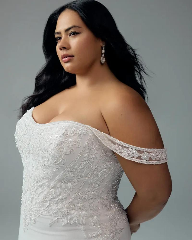 Make hearts race in our magnificent off-shoulder bridal gown, Mila. Crafted from royal crepe and misty tulle, Mila has a sexy fit-and-flare silhouette and a universally flattering sweetheart neckline with detachable lace off-the-shoulder straps. Her richly embellished bodice with sheer panel details is what will make brides fall in love with Mila. Lace appliqués trail down from the bodice to the shimmering tulle skirt, finishing the dress with fabric-covered buttons. The contrast between the crepe and tulle fabrics in Mila's skirt amplifies the drama in this sexy bridal gown! What's not to love?